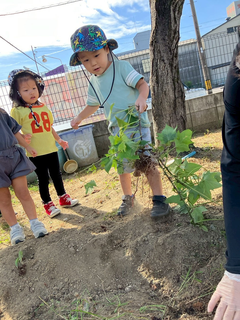 さつまいもあった~!亜気子 出原2025年10月3日読了時間: 1分園の畑でいもほりをしました。さつまいもが見えるとスコップを置いて、手で掘っていました。ツルがあるのでなかなか抜けず…大きいおいもが見つかるとうれしそうな子どもたちです。1歳児は砂場でおいもほりごっこをしました。次々見つかるおいもにうれしそうです。
